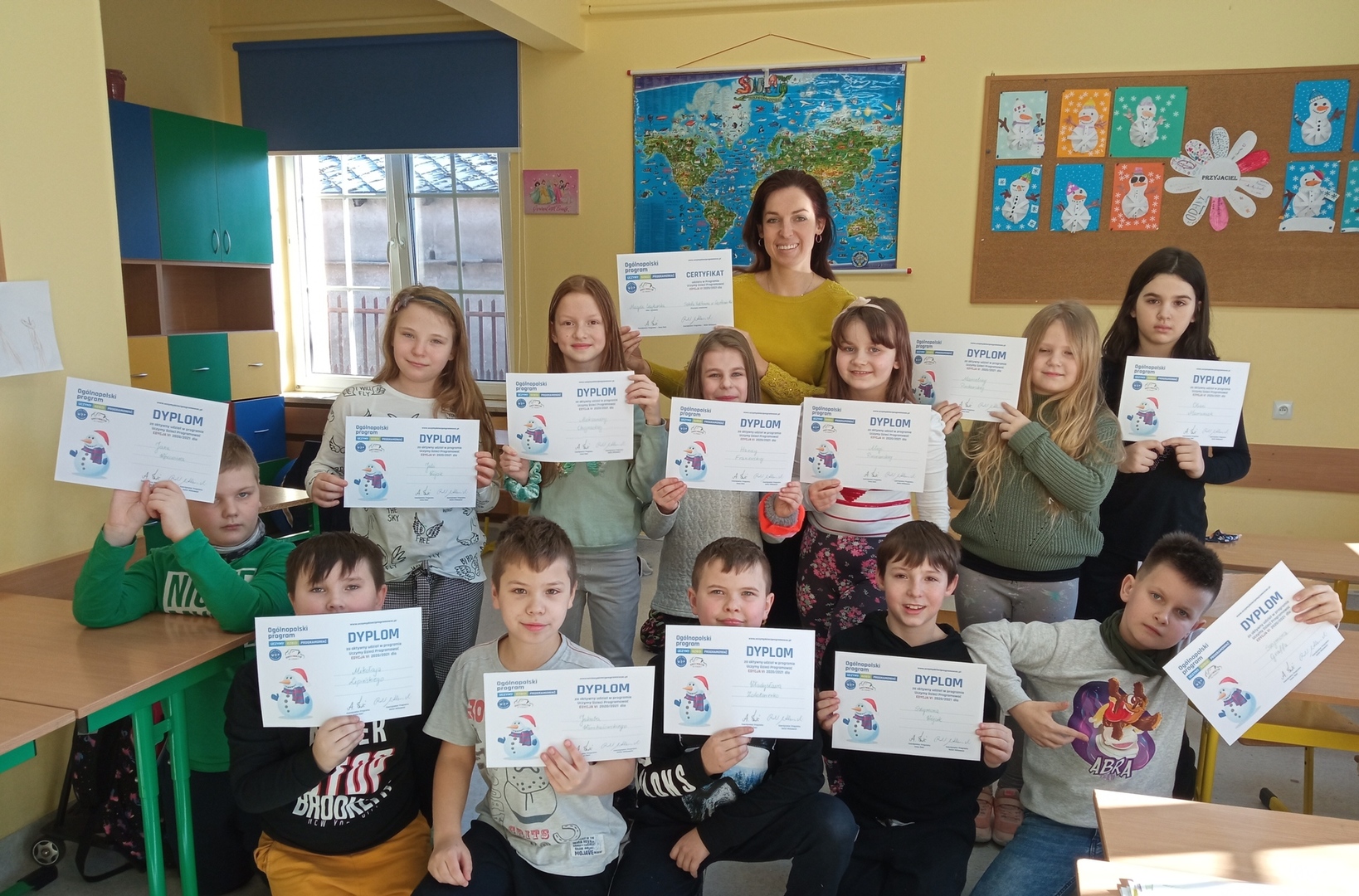 Za nami już VI edycja ogólnopolskiego programu Uczymy Dzieci Programować. Dzieci z klasy III już dwukrotnie uczestniczyły w tym wydarzeniu. Cotygodniowe zajęcia owocowały w nowe wyzwania. Uczniowie rozwijali swoje umiejętności kodowania i programowania przy pomocy Ozobota, środowiska Scratch i wirtualnej maty. Praca została doceniona, dzieci obdarowano zasłużonymi dyplomami, a nauczyciela certyfikatem nadesłanymi przez firmę Edu-Sense.