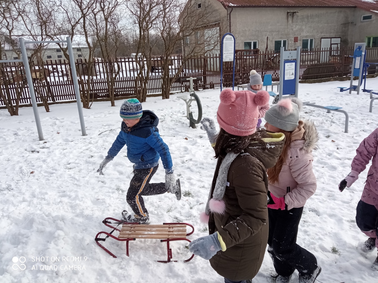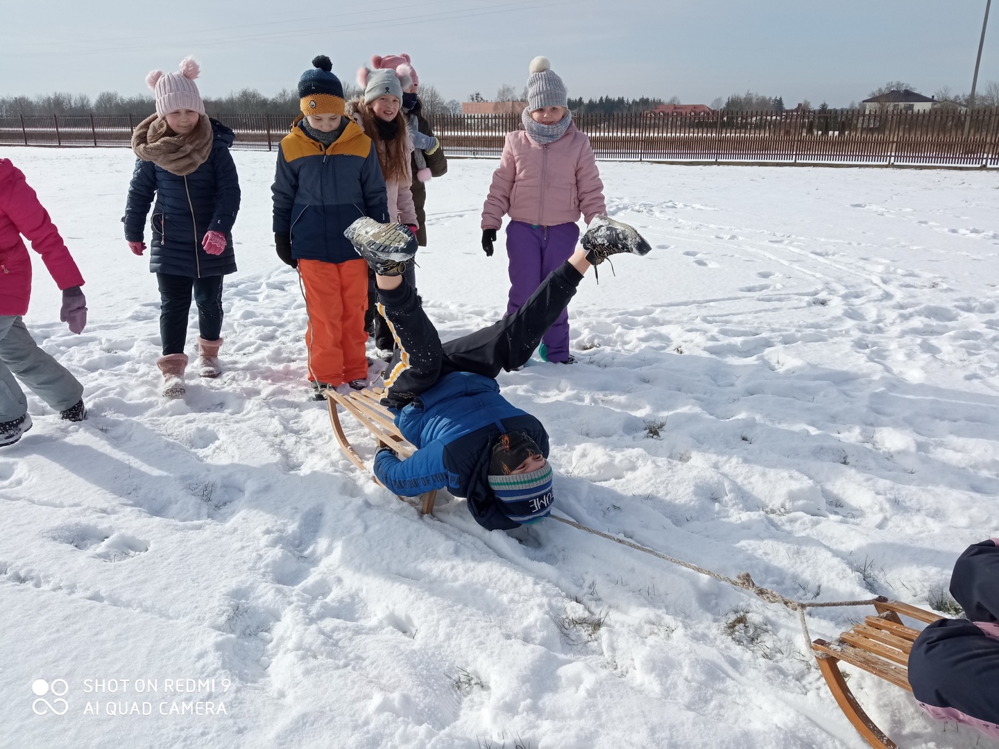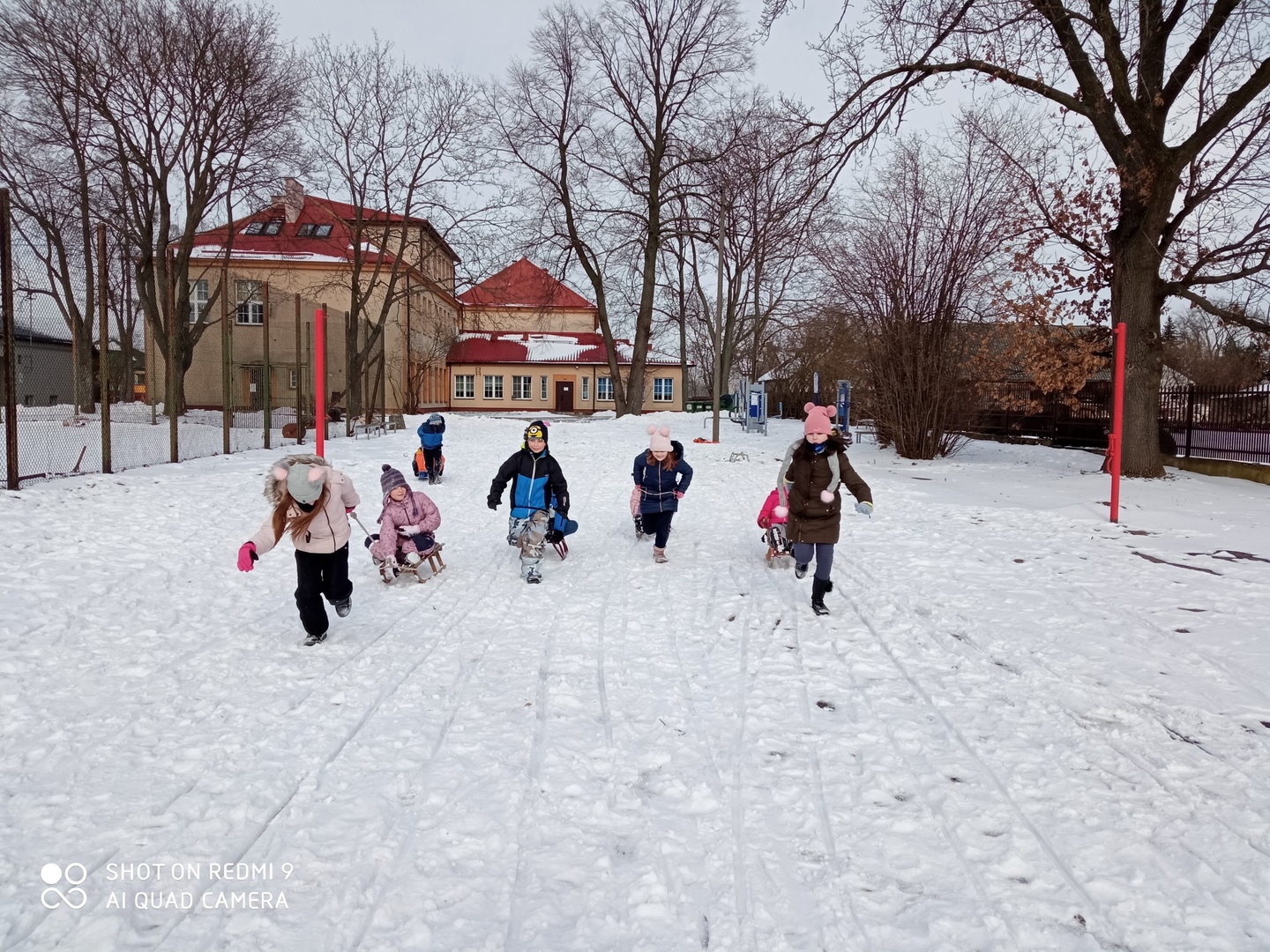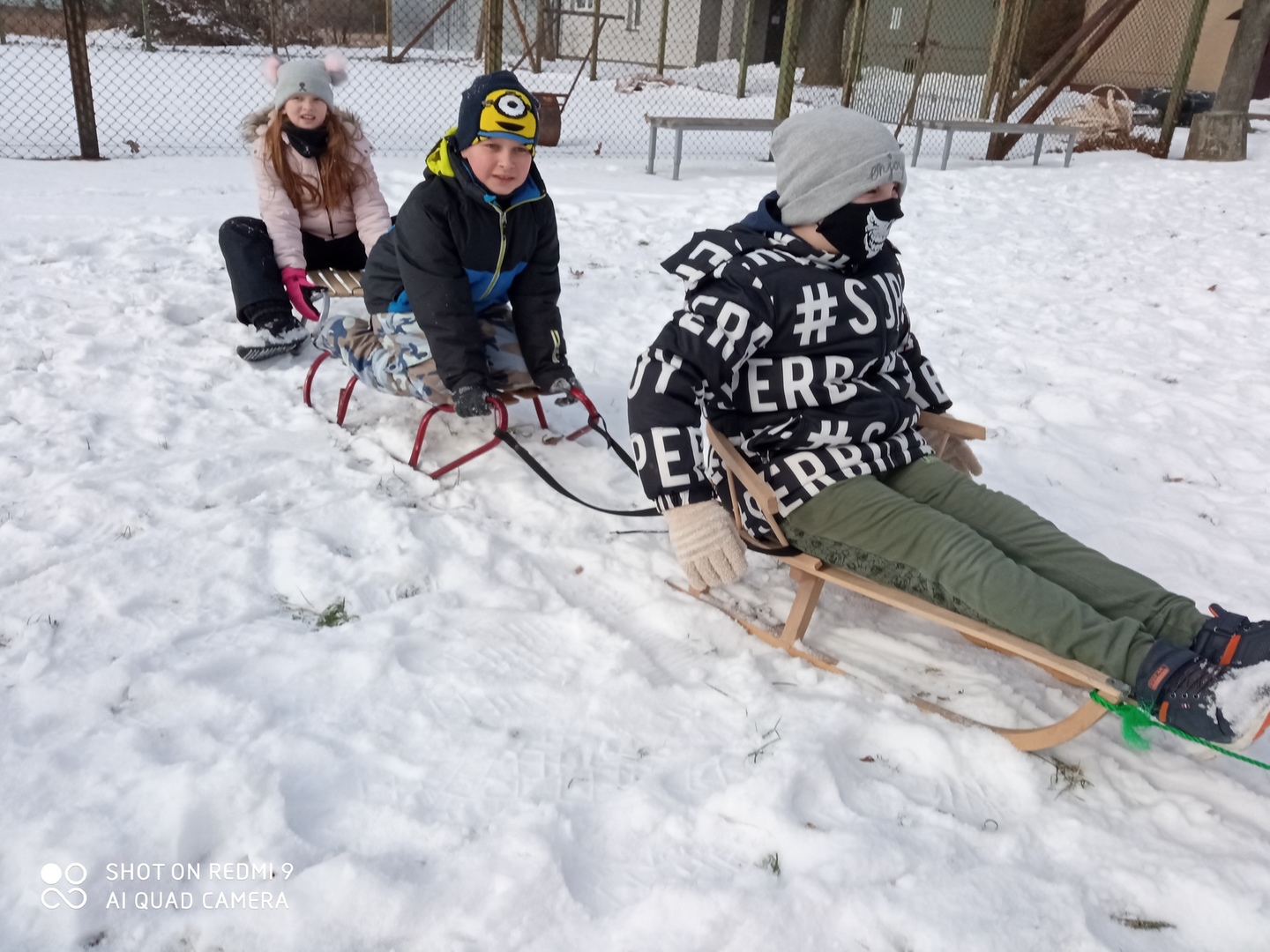 Zima jak co roku zaskoczyła drogowców, ale nie naszych pierwszaków. Zabezpieczeni przed mrozem i śniegiem, wyposażeni w sanki i inny sprzęt sportowy wyruszyli na zajęcia sportowe na świeżym powietrzu.