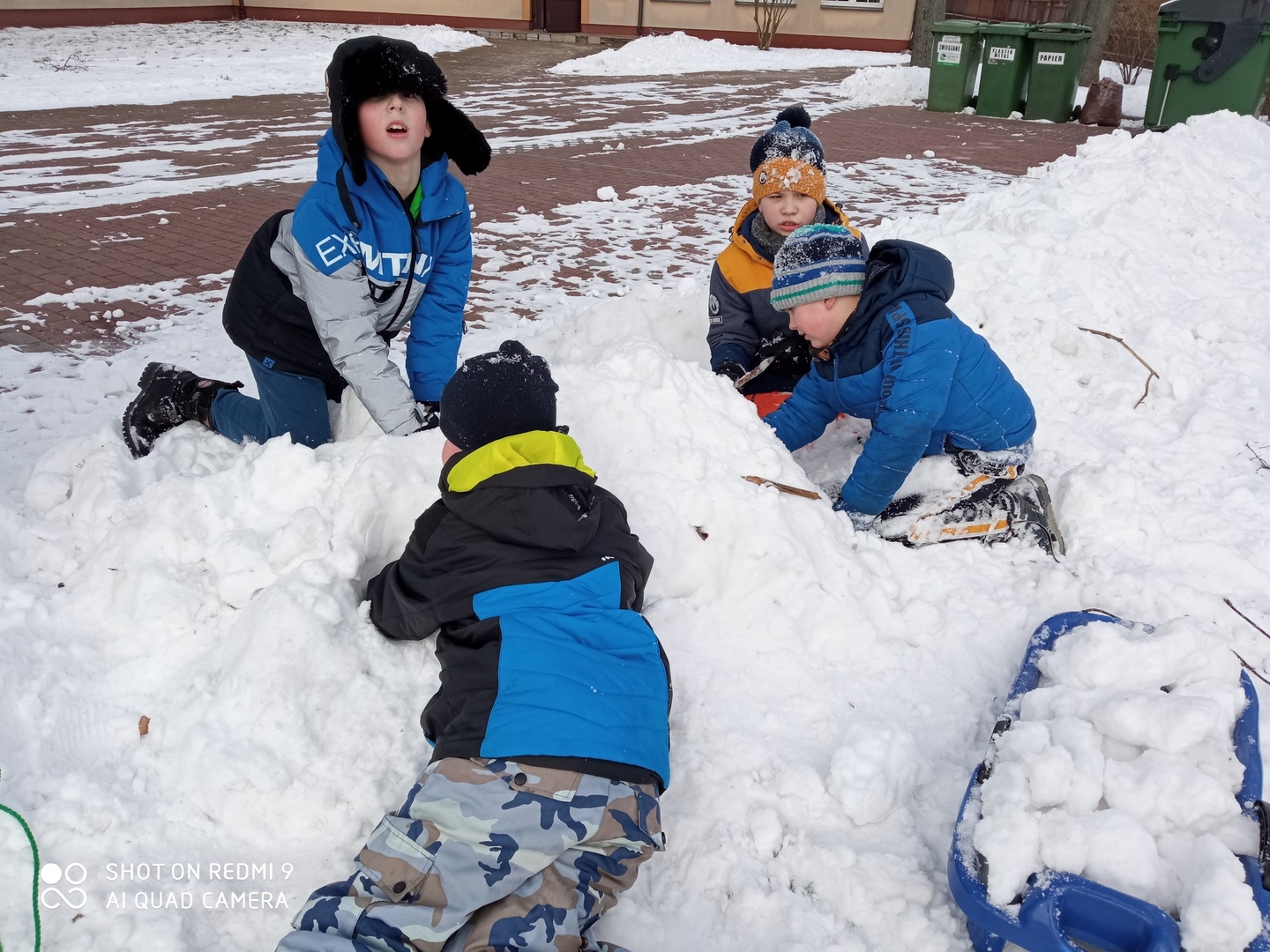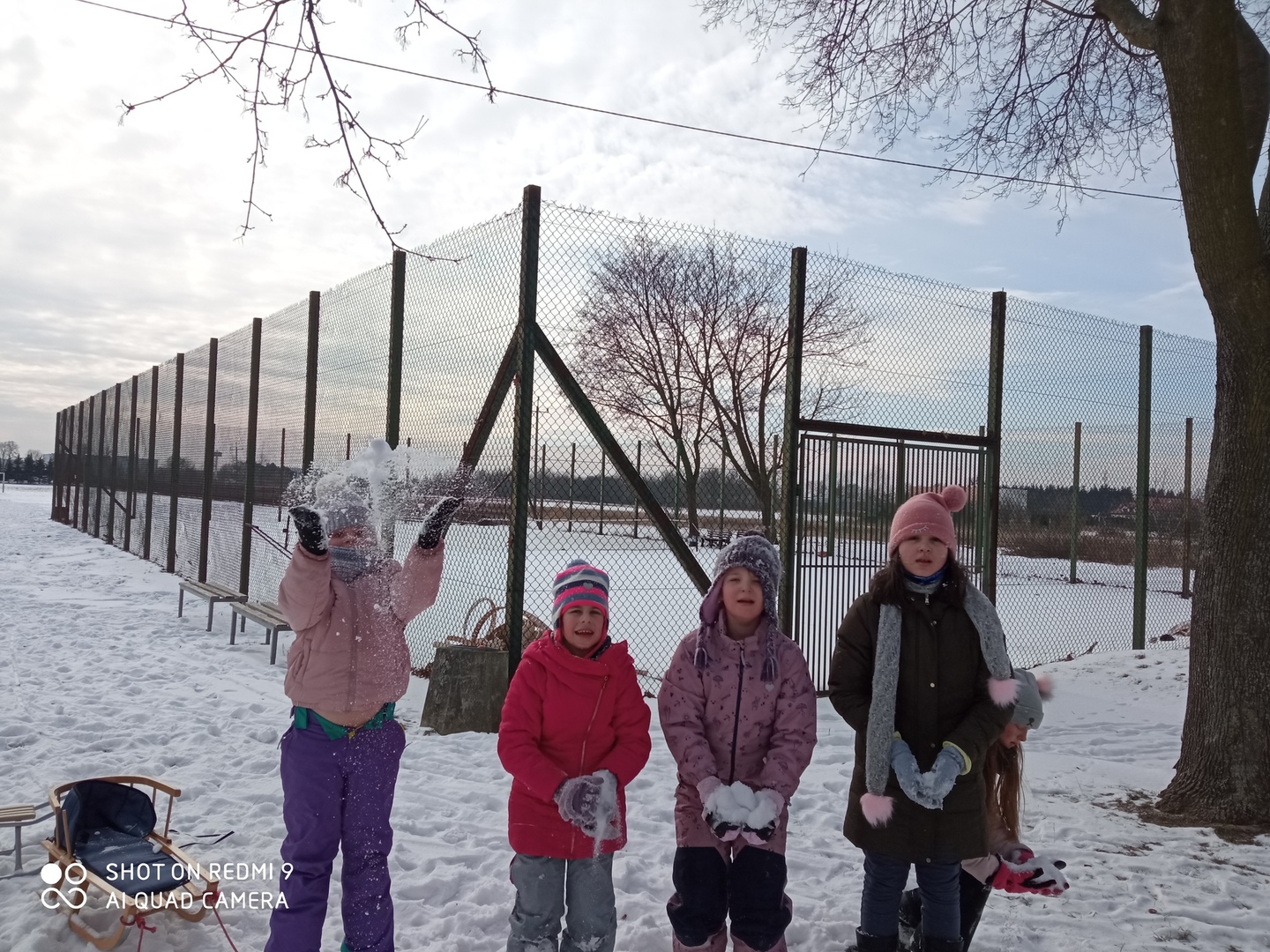 Mimo zimna zabawa była bardzo udana- nie zabrakło elementów rywalizacji podczas różnych wyścigów, były bitwy na śnieżki, anioły na śniegu. Tego dnia zabrakło tylko bałwanów, bo świeżutki, puchaty śnieg nie chciał się lepić w większe kule. Jednak niezbyt się tym smuciliśmy, bo śnieżne grubasy zrobiliśmy już wcześniej, a pomysłów na zabawy starczyłoby na cały miesiąc.