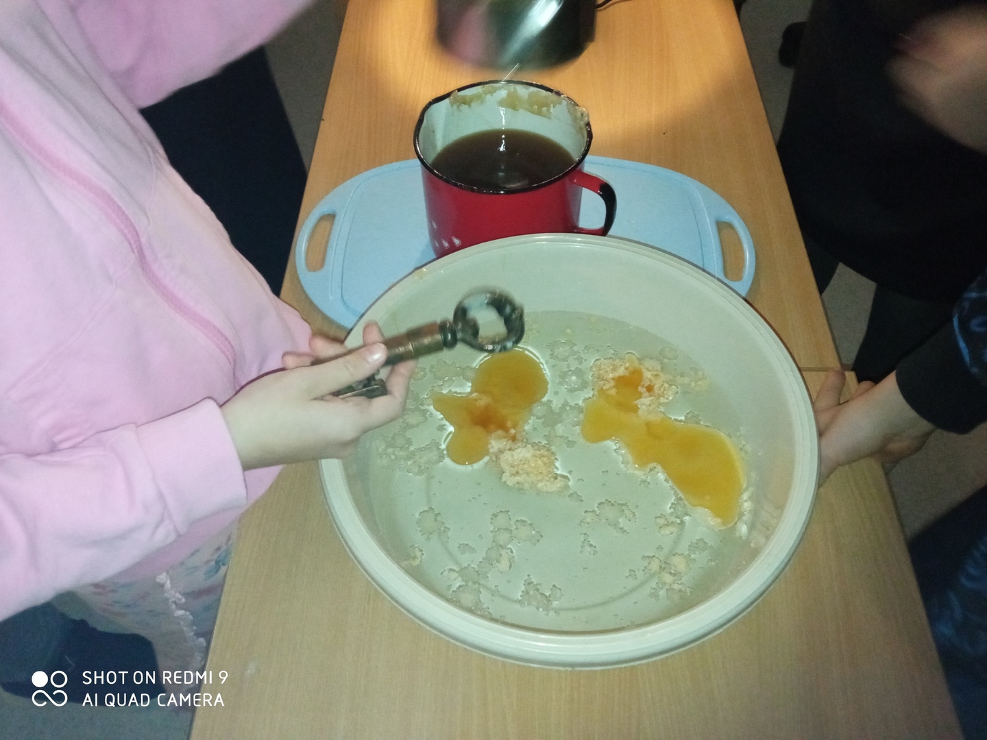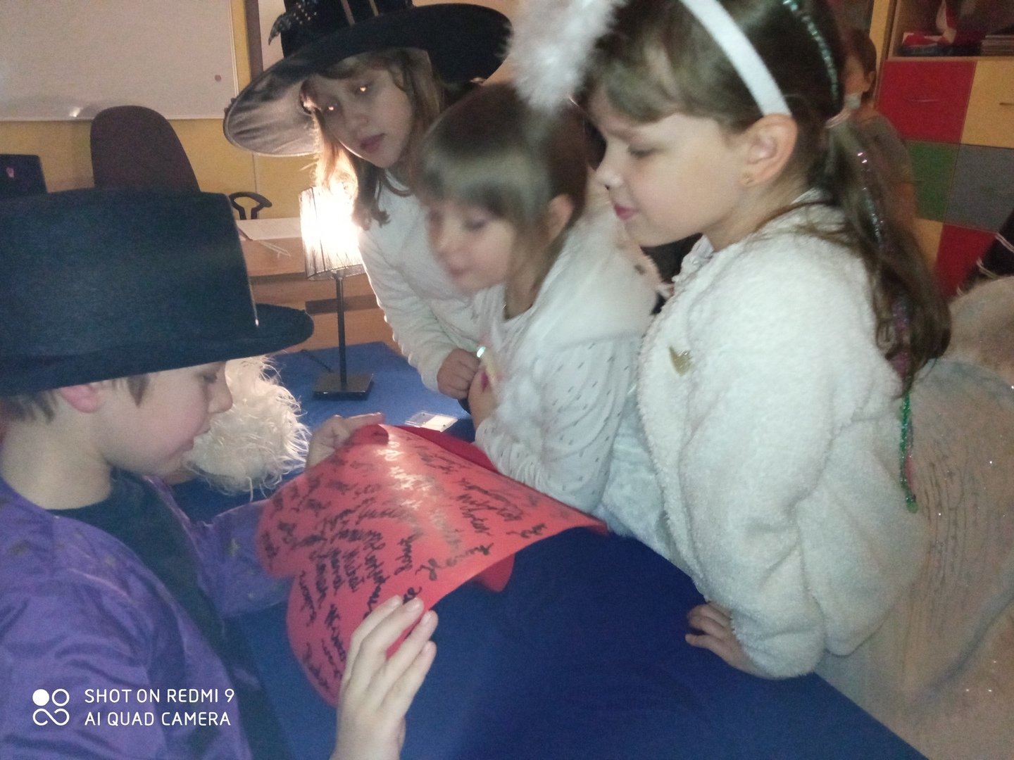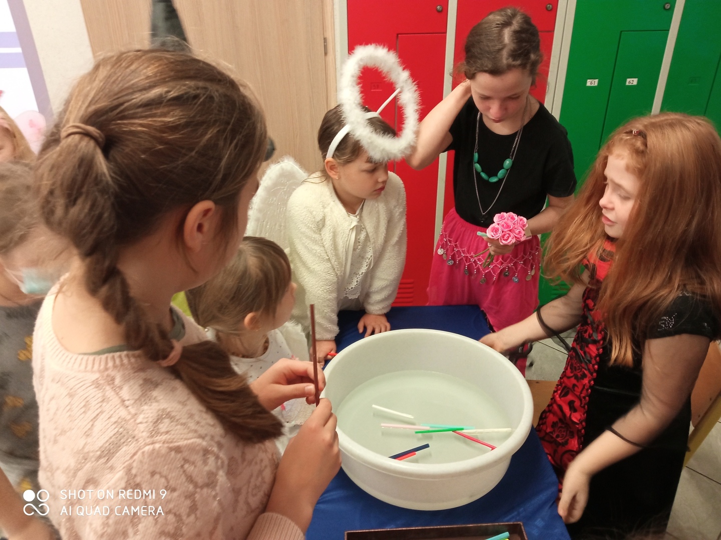 Tradycje wróżb andrzejkowych są głęboko zakorzenione w polskiej kulturze i zawsze stanowią pretekst do wspólnej zabawy. Od wieków w tym szczególnym dniu panny i kawalerowie próbują odnaleźć odpowiedź na pytanie kim będzie przyszły mąż czy żona. Aby przybliżyć tę tajemną wiedzę klasa II z wychowawczynią przygotowała i poprowadziła dla reszty uczniów klas I-III szkolny salon wróżb. Każdy chętny, lejąc wosk przez dziurkę, mógł dowiedzieć się, jak będzie wyglądać przyszły oblubieniec, wywróżyć imię czy profesję przyszłego ukochanego, a nawet rzucić monetą do źródełka, aby w ten sposób potwierdzić, czy spełnią się najskrytsze marzenia. Nie zabrakło też wróżby z udziałem butów, przepowiadającej, kto z grona młodziutkich kawalerów i panien jako pierwszy weźmie ślub. Mimo, że każdy z uczniów wiedział, że to tylko żarty, to wszyscy z ekscytacją wzięli udział we wspólnej zabawie.