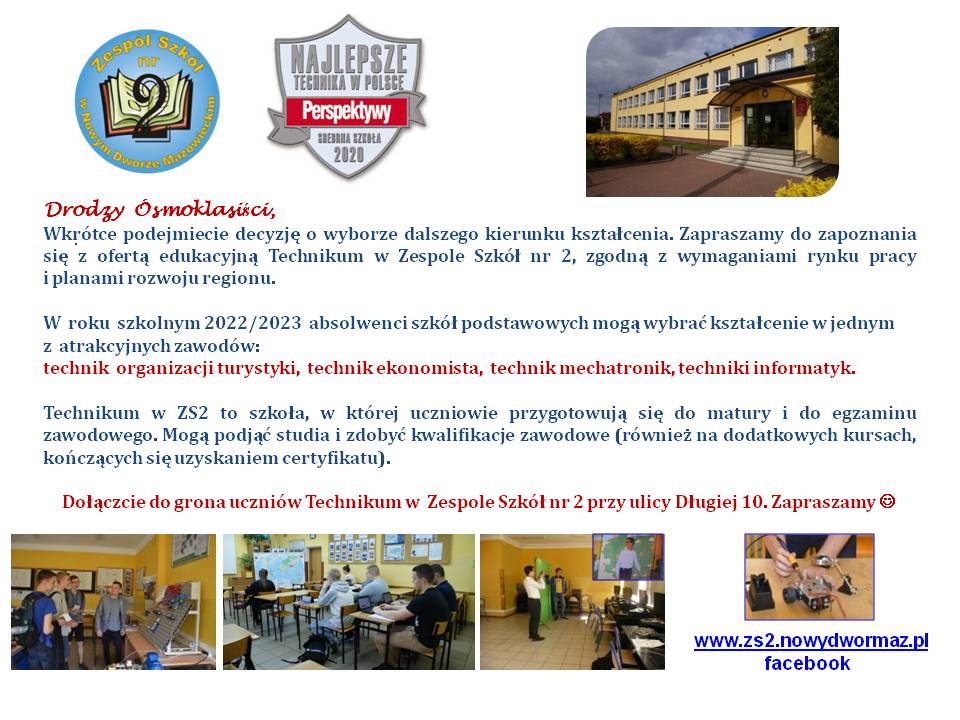 Szanowni Państwo, poniżej ósmoklasiści naszej szkoły mogą się zapoznać z linkami informacyjnymi do Technikum w Zespole Szkół nr 2 na rok szkolny 2022/2023, zasadach rekrutacji oraz harmonogramie działań kandydata.