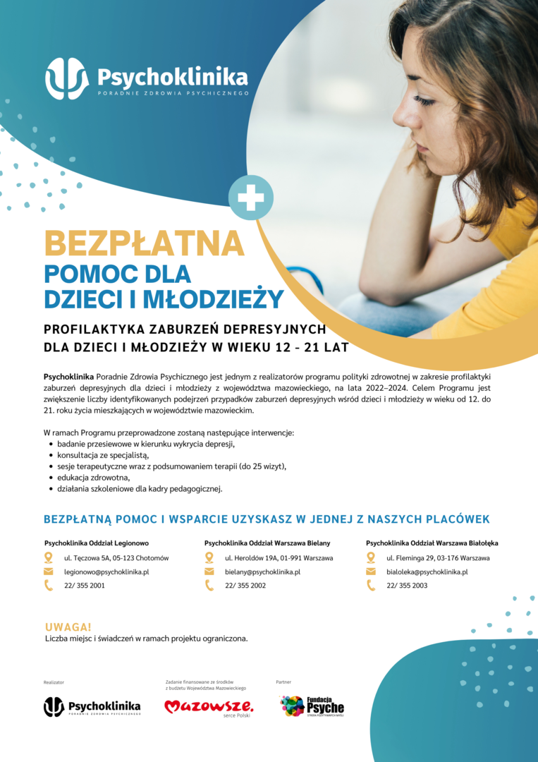 Fundacja Psyche - Strefa Pozytywnych Myśli jako partner Psychokliniki - Poradnie Zdrowia Psychicznego informuje o możliwości skorzystania z BEZPŁATNEJ pomocy dla dzieci i młodzieży z całego województwa mazowieckiego.