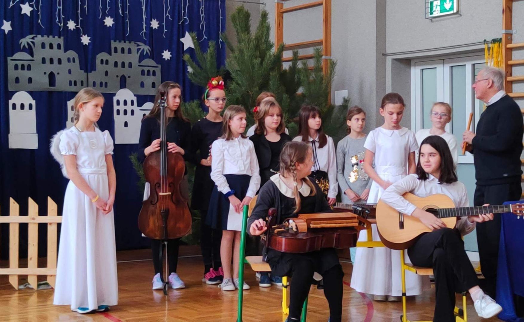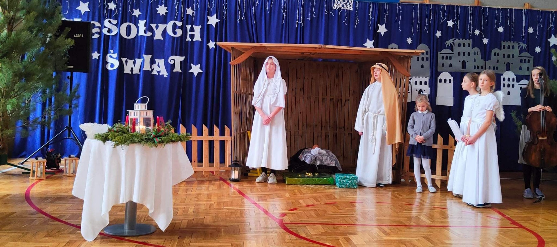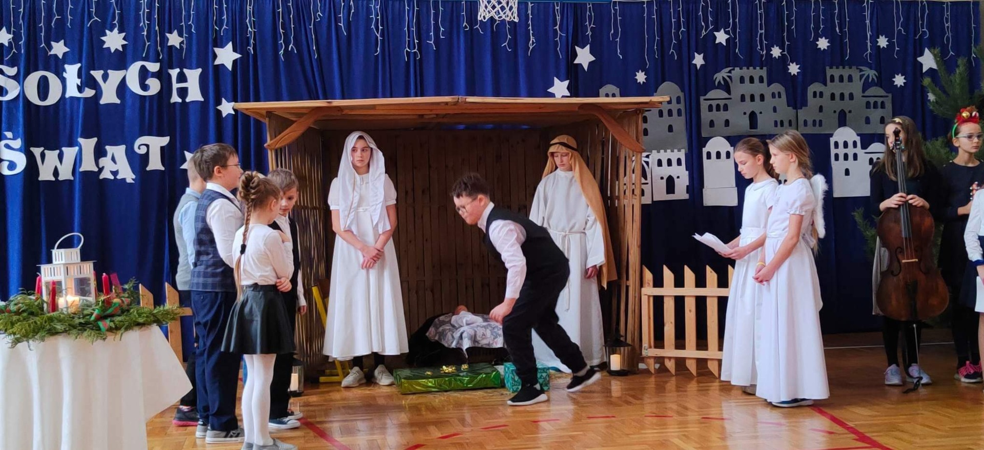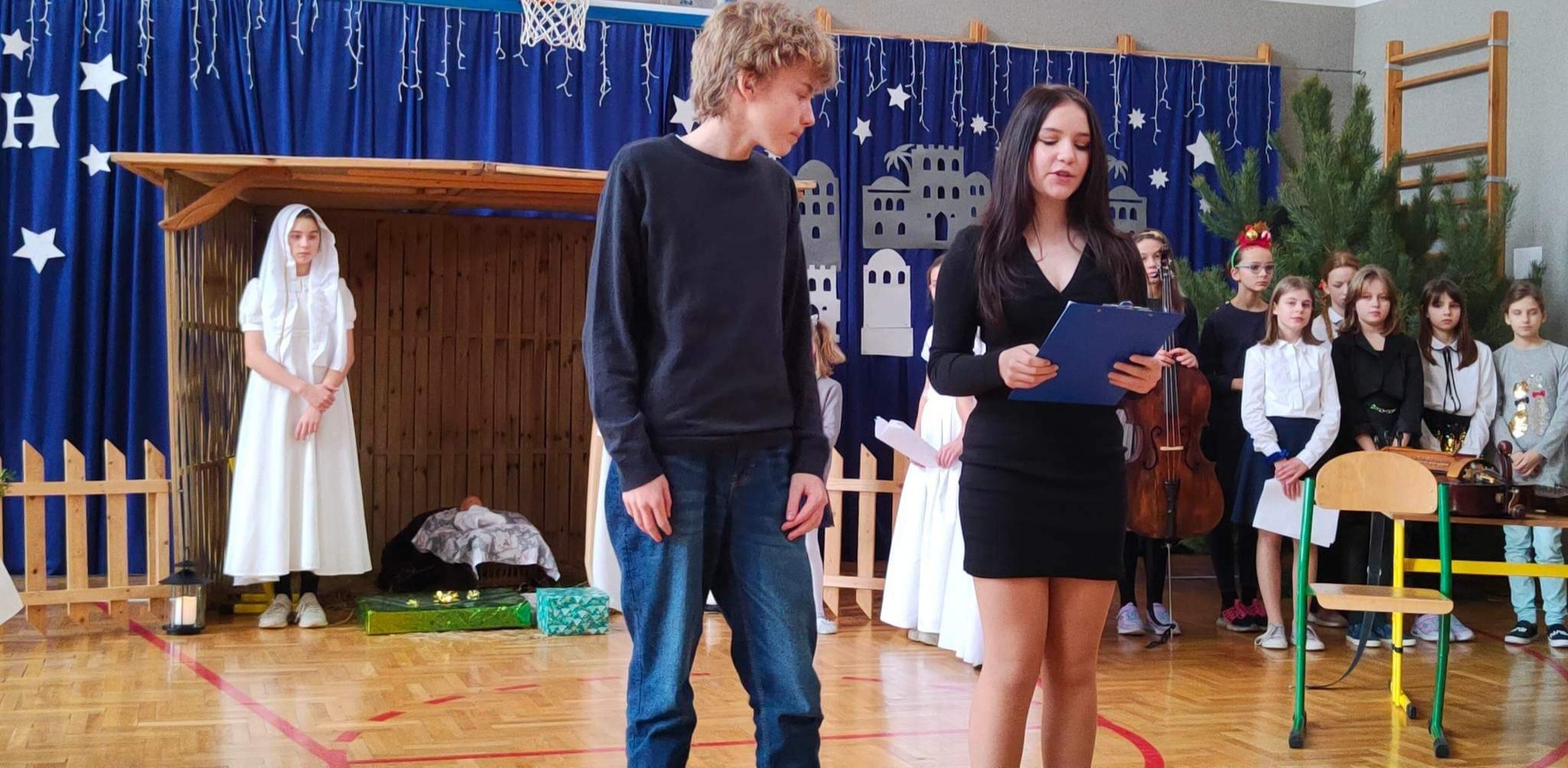 Uczniowie naszej szkoły zaprezentowali przepiękne Jasełka sięgające swoją tradycją do misterii franciszkańskich. Nazwa Jaseła wywodzi się od staropolskiego słowa "jasło" oznaczajacego "żłób". Oprawę muzyczną spotkania stanowiły cymbały, lira korbowa, basetla oraz sopiłka wykonane przez znanego lutnika Stanisława Wyżykowskiego. Po przedstawieniu życzenia całej szkolnej wspólnocie złożyła Pani dyrektor Edyta Bielecka, przedstawiciele szkolnego samorządu: Szymon i Maja oraz ksiądz proboszcz Adam Bednarek.