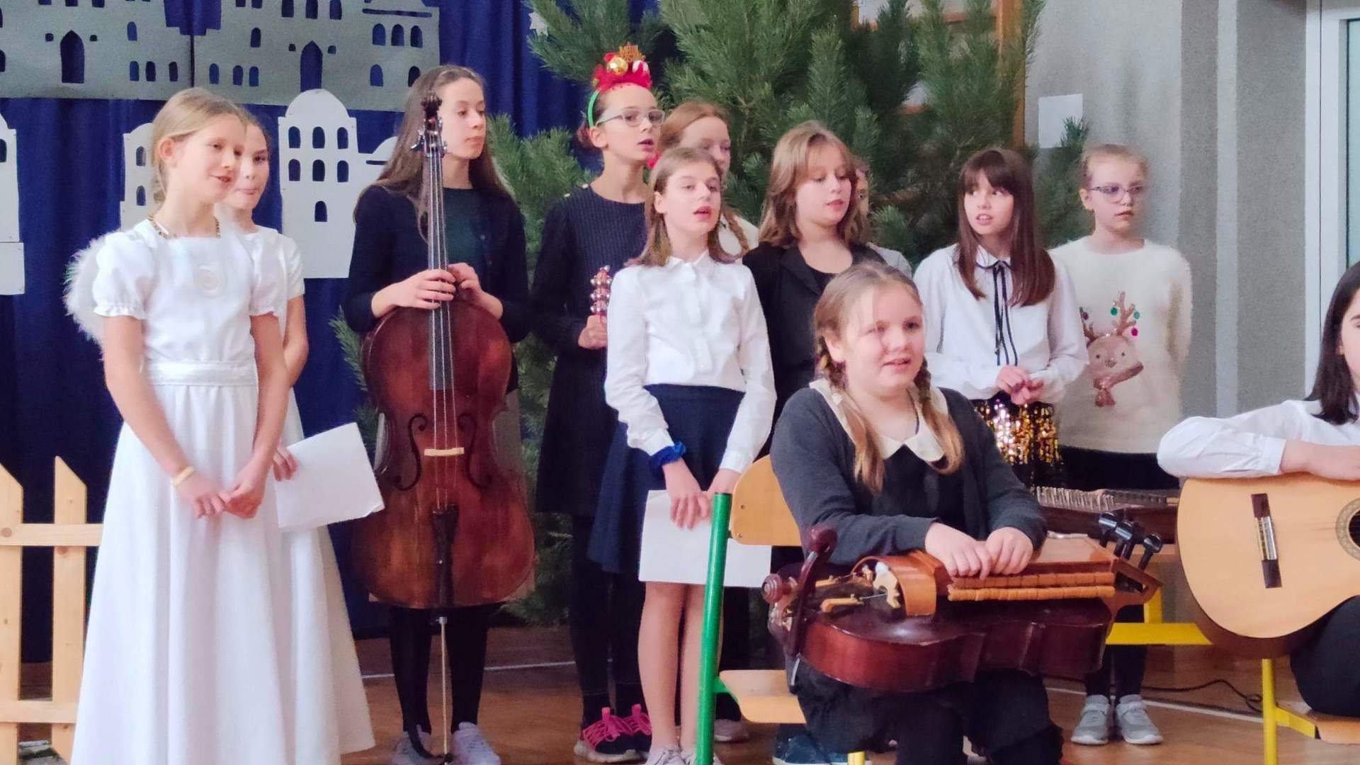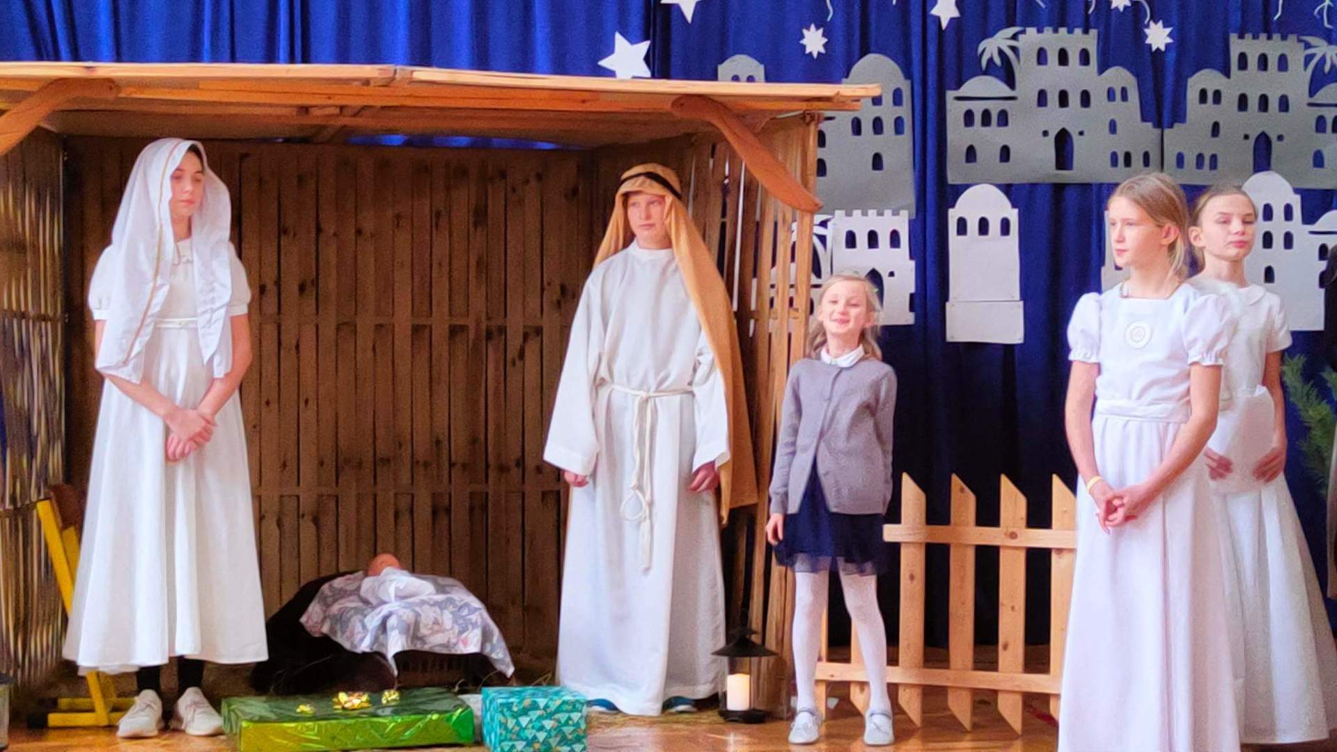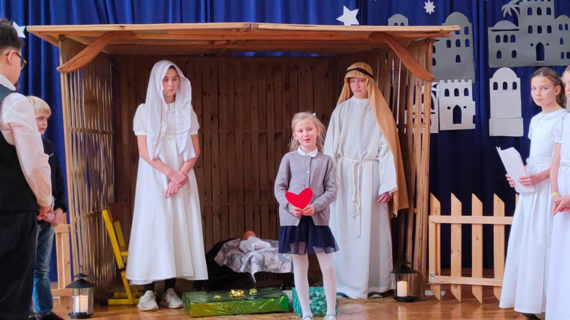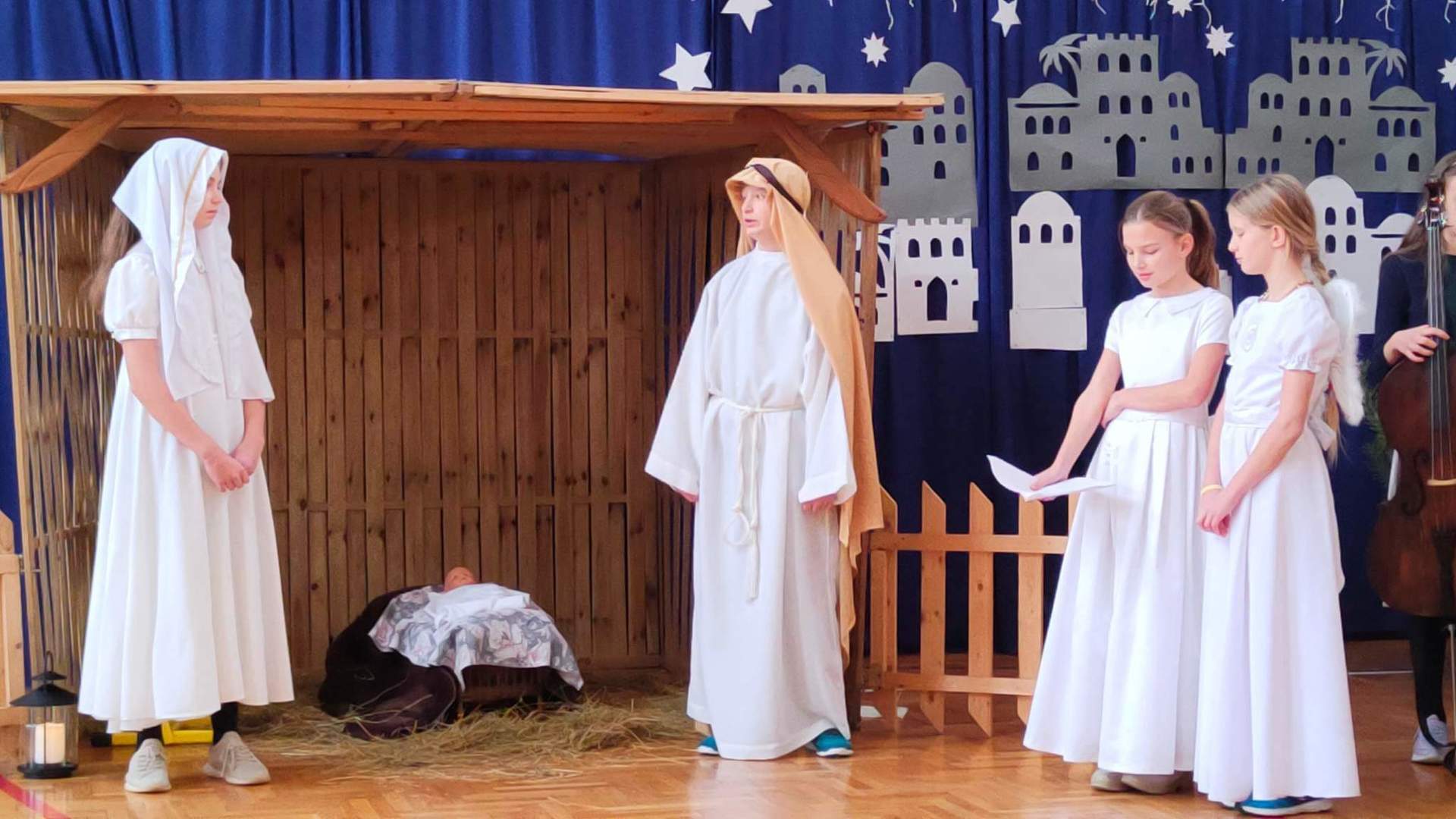 Uczniowie naszej szkoły zaprezentowali przepiękne Jasełka sięgające swoją tradycją do misterii franciszkańskich. Nazwa Jaseła wywodzi się od staropolskiego słowa "jasło" oznaczajacego "żłób". Oprawę muzyczną spotkania stanowiły cymbały, lira korbowa, basetla oraz sopiłka wykonane przez znanego lutnika Stanisława Wyżykowskiego. Po przedstawieniu życzenia całej szkolnej wspólnocie złożyła Pani dyrektor Edyta Bielecka, przedstawiciele szkolnego samorządu: Szymon i Maja oraz ksiądz proboszcz Adam Bednarek.