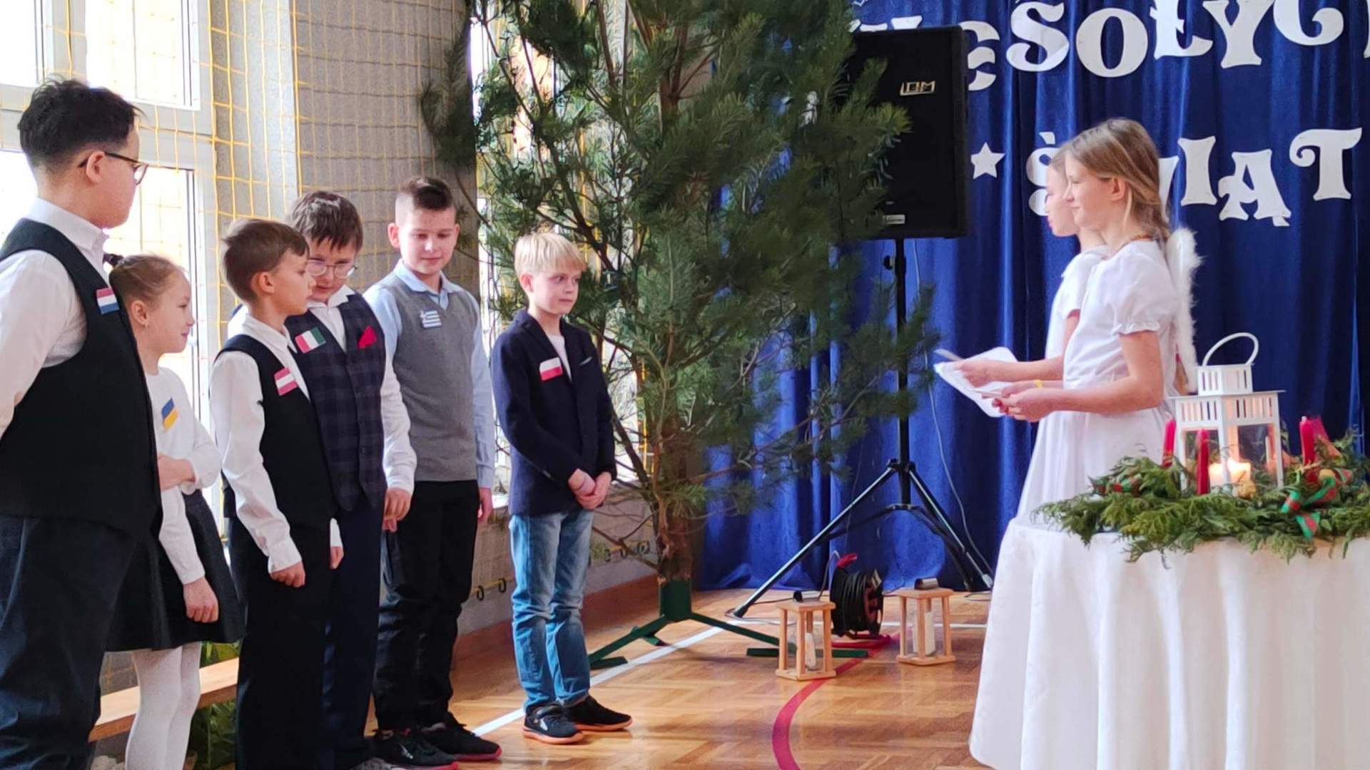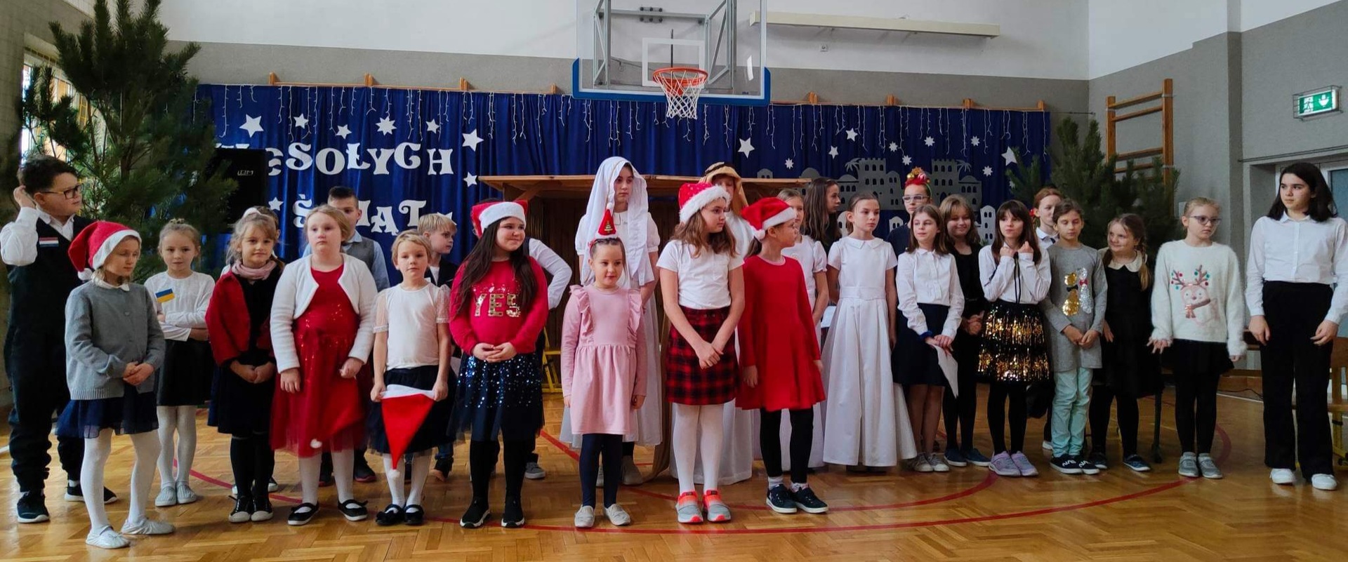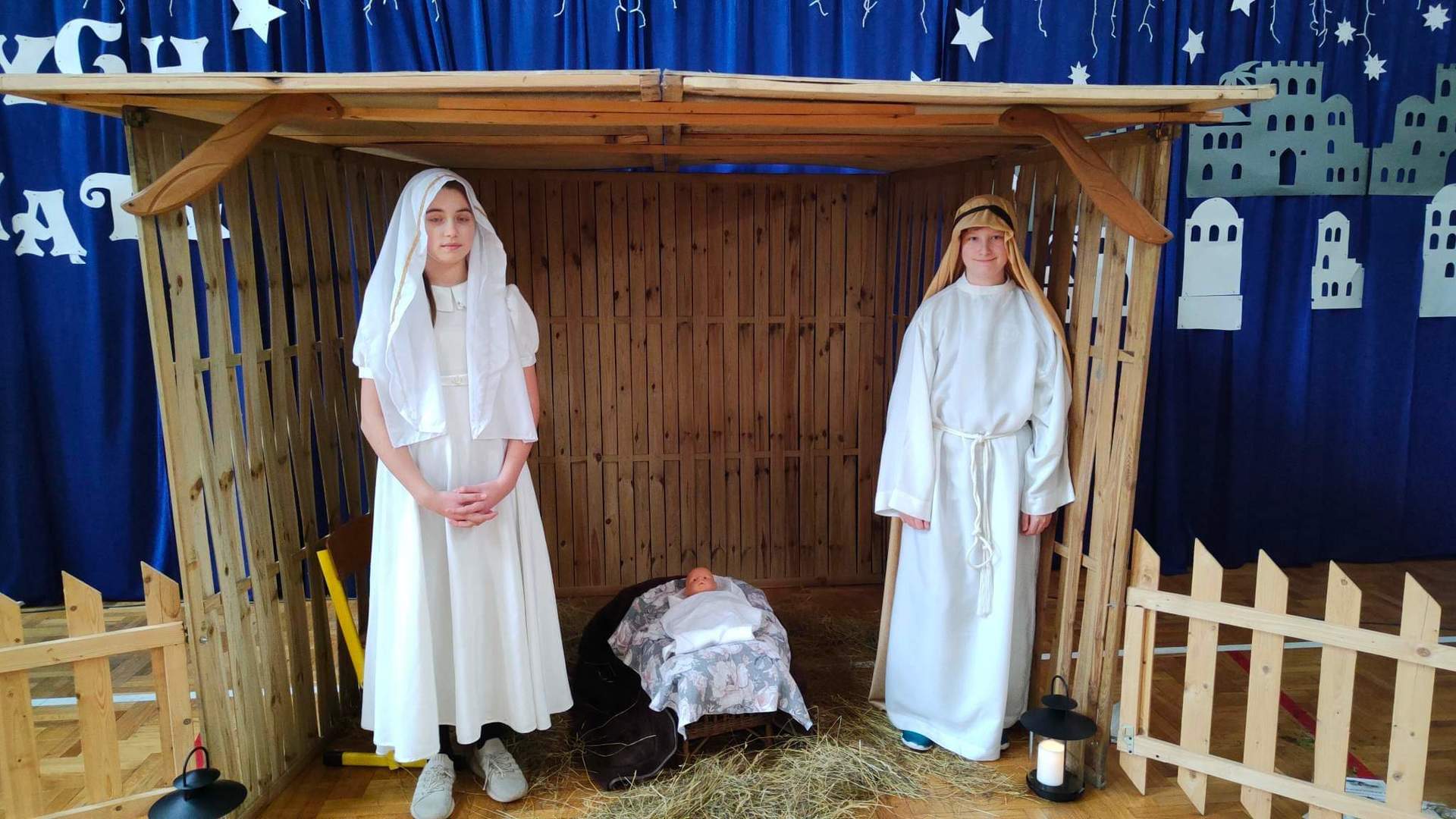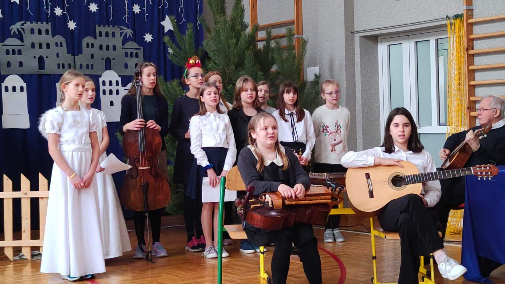 Uczniowie naszej szkoły zaprezentowali przepiękne Jasełka sięgające swoją tradycją do misterii franciszkańskich. Nazwa Jaseła wywodzi się od staropolskiego słowa "jasło" oznaczajacego "żłób". Oprawę muzyczną spotkania stanowiły cymbały, lira korbowa, basetla oraz sopiłka wykonane przez znanego lutnika Stanisława Wyżykowskiego. Po przedstawieniu życzenia całej szkolnej wspólnocie złożyła Pani dyrektor Edyta Bielecka, przedstawiciele szkolnego samorządu: Szymon i Maja oraz ksiądz proboszcz Adam Bednarek.