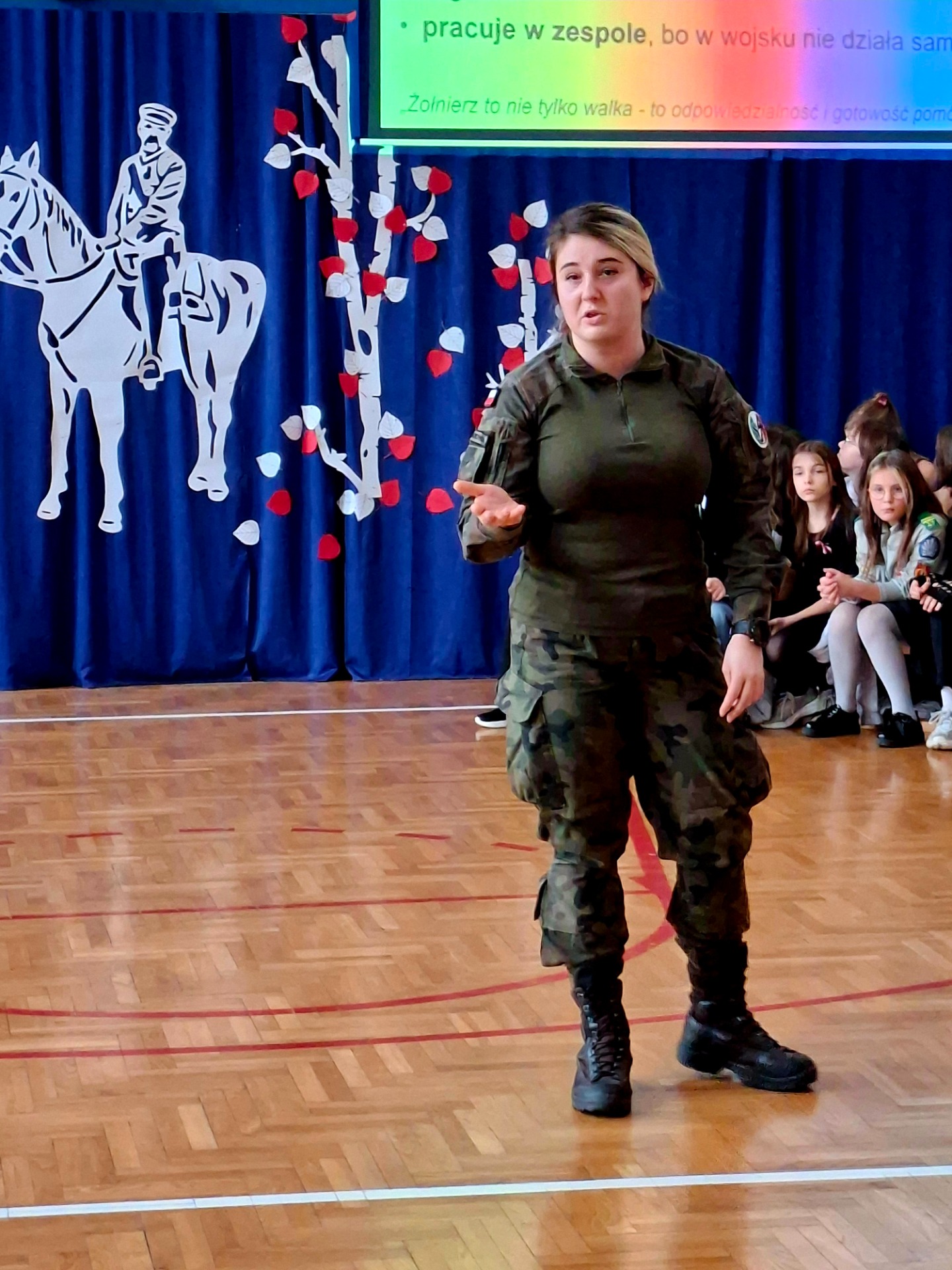 i radości. Tego dnia mieliśmy także zaszczyt gościć panią podporucznik Adriannę Ogonowską, która po występach artystycznych opowiedziała uczniom o swojej służbie